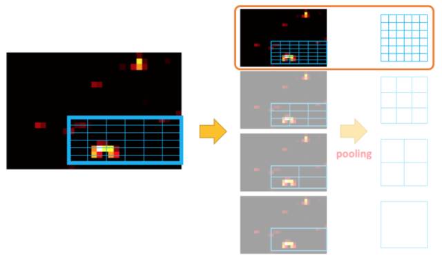 一旦和位置绑定了, 那么特征计算, 就从以前的中心点, 变成了一系列从上下左右的不同子框去看的特征图。 那么再把这些组合起来。 即暗含了不同空间信息。类别的说,就是你先上下左右的看这个山峰, 回头把看的拼接起来, 判断山峰有没有认错。 选择好不同位子的特征,再整合起来, 得到在不同位子点确认的特征, 再做Pooling,  通过Pooling进行投票。