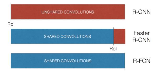 前面我们提到了从R-CNN到Faster R-CNN主要的技术思想就是避免特征计算浪费。 所以要把ConvNet特征计算前移,只做一次计算。 而把区域操作后移。 我们也提到Faster R-CNN在RoI之后还有部分ConvNet的计算。 有没有可能把ROI之上的计算进一步前移? R-FCN(Region-based Fully Convolutional Networks) 基于这个思路,做到了,所以更快, 某种意义上,是Fatest R-CNN。