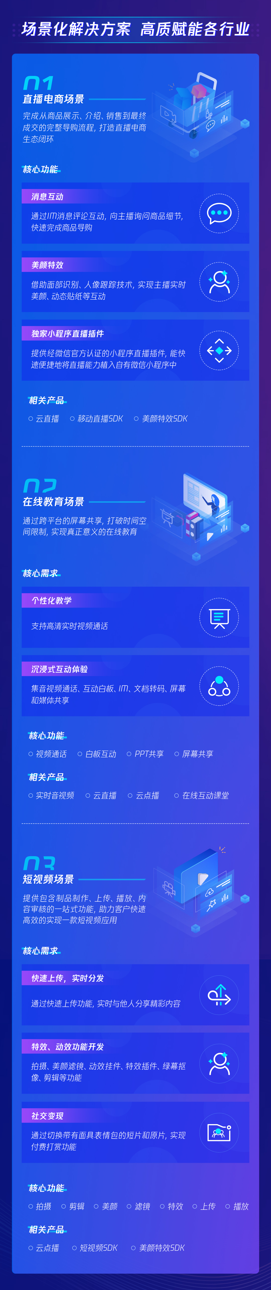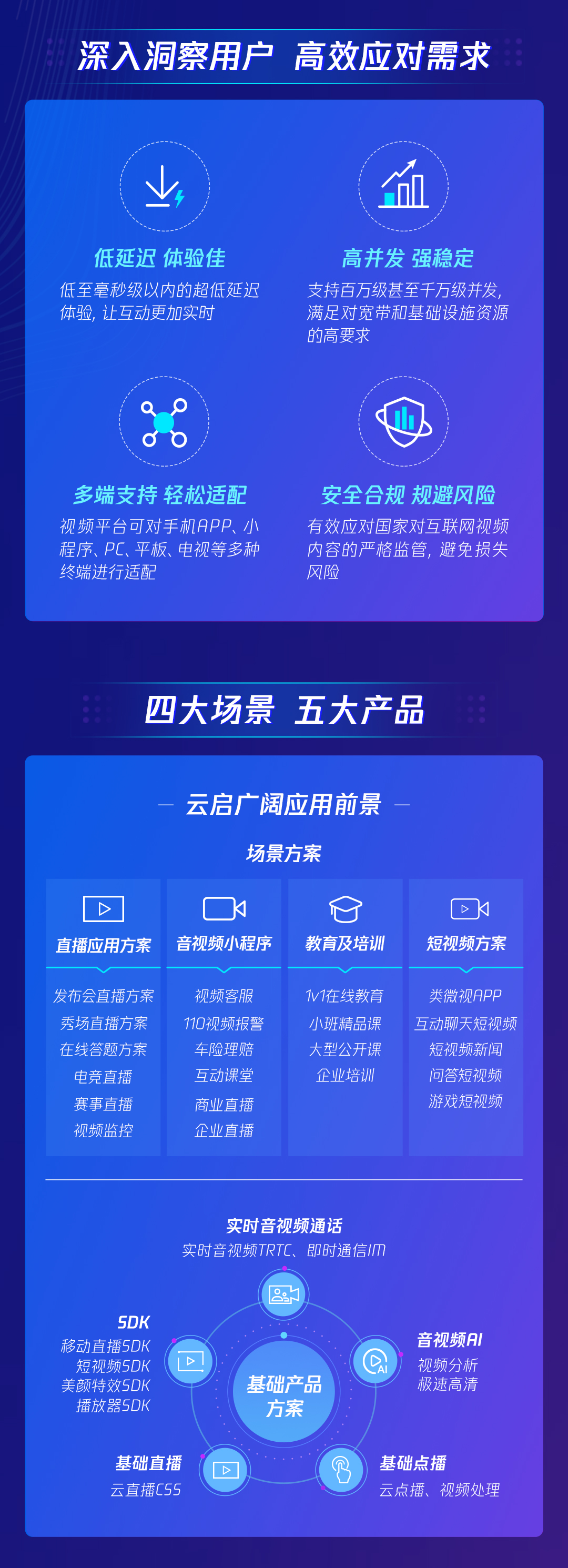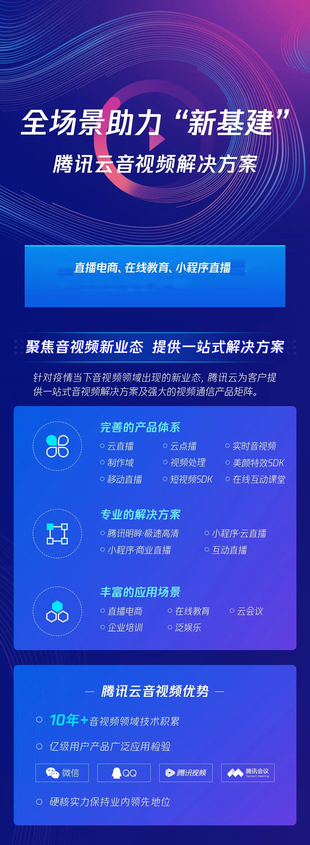 针对疫情当下音视频领域出现的新业态,腾讯云为客户提供一站式音视频解决方案以及强大的视频通讯产品矩阵。
