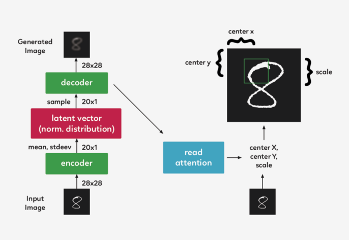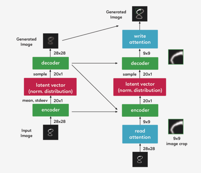# We set up the model parameters # ------------------------------ # image width,height self.img_size = 28 # read glimpse grid width/height self.attention_n = 5 # number of hidden units / output size in LSTM self.n_hidden = 256 # QSampler output size self.n_z = 10 # MNIST generation sequence length self.sequence_length = 10 # training minibatch size self.batch_size = 64 # workaround for variable_scope(reuse=True) self.share_parameters = False # Build our model self.images = tf.placeholder(tf.float32, [None, 784]) # input (batch_size * img_size) self.e = tf.random_normal((self.batch_size, self.n_z), mean=0, stddev=1) # Qsampler noise self.lstm_enc = tf.nn.rnn_cell.LSTMCell(self.n_hidden, state_is_tuple=True) # encoder Op self.lstm_dec = tf.nn.rnn_cell.LSTMCell(self.n_hidden, state_is_tuple=True) # decoder Op