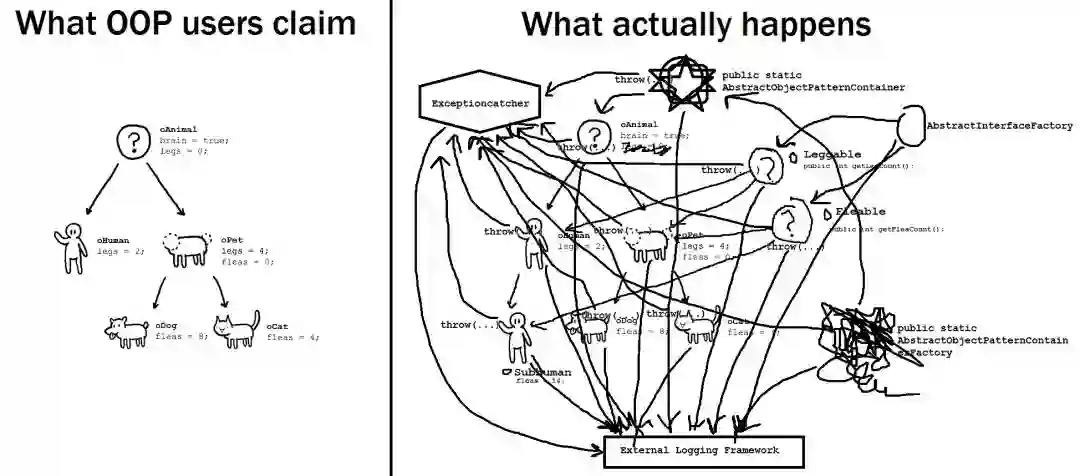 为什么我们坚持使用一种从根本上来说不尽如人意的组织程序的方式?这完全是无知吗?我对此表示怀疑,从事软件工程的人不笨。是我们使用诸如“设计模式”、“抽象”、“封装”、“多态性”和“接口隔离”之类的花哨OOP术语,从而在同行面前显得“看起来聪明”?恐怕不是。