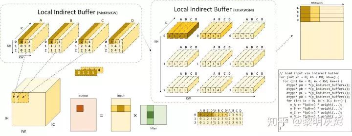 图中将平面缓冲区绘制成三维形式(增加 IC 维度),意在说明间接缓冲区的每个指针可索引 IC 个输入元素,而每个间接缓冲区索引的内容即为与权重对应的输入内存区域。