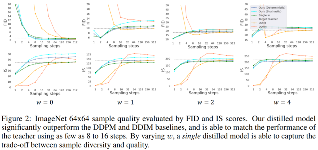 利用提出的方法,单个蒸馏模型能够处理各种不同的指导强度,从而高效地对样本质量和多样性进行权衡。此外为了从他们的模型中采样,研究者考虑了文献中已有的确定性采样器,并进一步提出了随机采样过程。