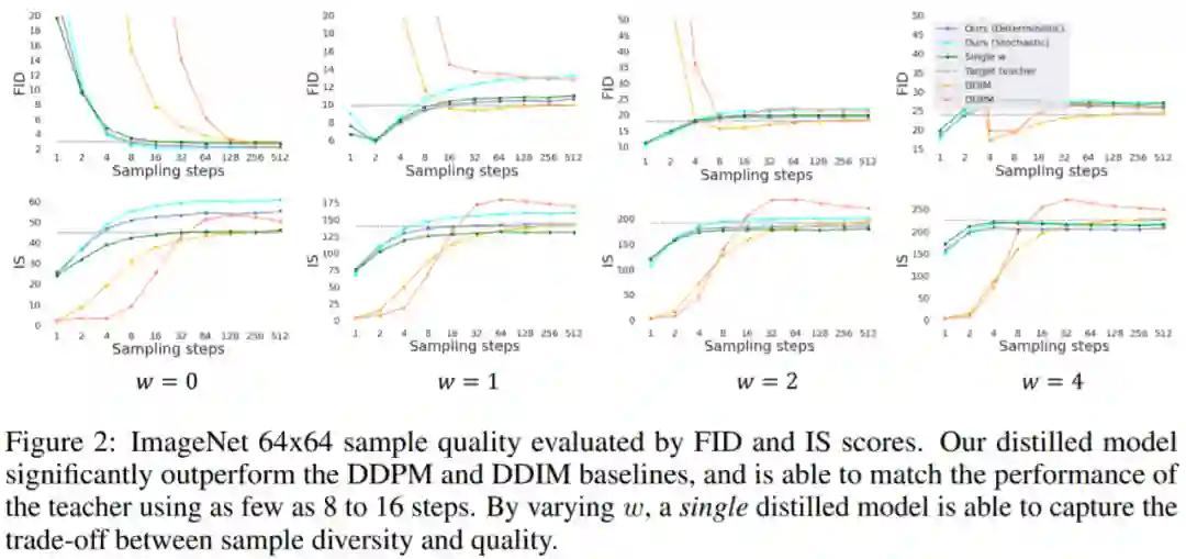 然而,无分类器指导的一大关键局限是它的采样效率低下,需要对两个扩散模型评估数百次才能生成一个样本。这一局限阻碍了无分类指导模型在真实世界设置中的应用。尽管已经针对扩散模型提出了蒸馏方法,但目前这些方法不适用无分类器指导扩散模型。