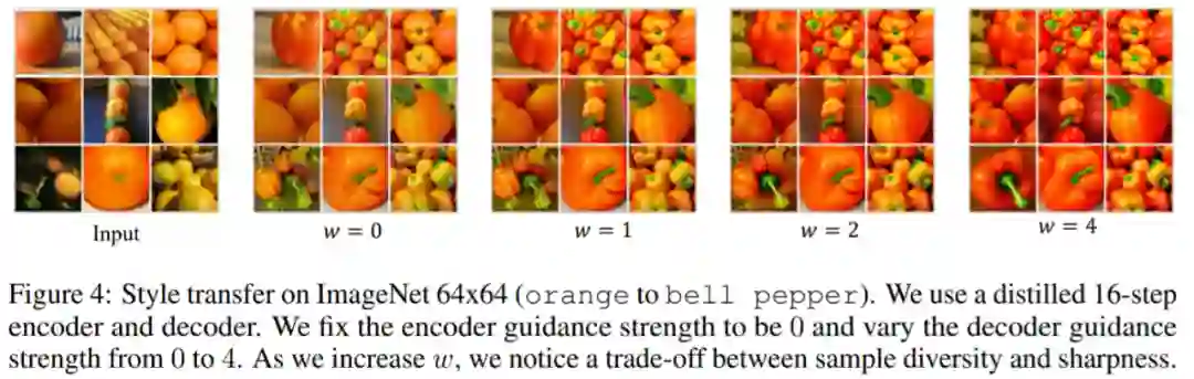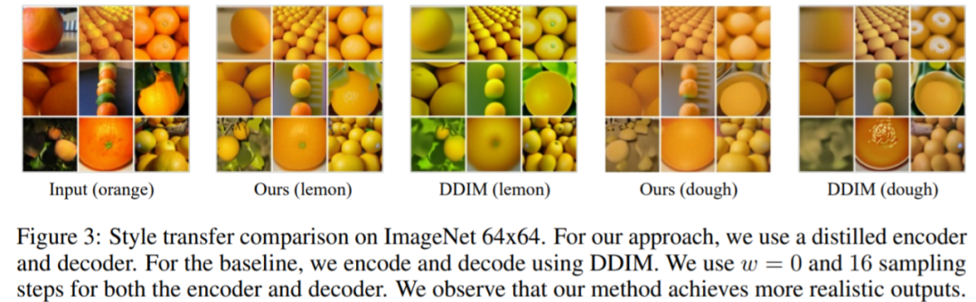 本文还进行了如下实验。具体来说,为了在两个域 A 和 B 之间执行风格迁移,本文使用在域 A 上训练的扩散模型对来自域 A 的图像进行编码,然后使用在域 B 上训练的扩散模型进行解码。由于编码过程可以理解为反向 DDIM 采样过程,本文在无分类器指导下对编码器和解码器进行蒸馏,并与下图 3 中的 DDIM 编码器和解码器进行比较。
