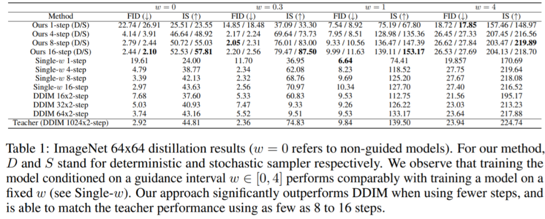 实验评估了蒸馏方法的性能,本文主要关注模型在 ImageNet 64x64 和 CIFAR-10 上的结果。他们探索了指导权重的不同范围,并观察到所有范围都具有可比性,因此实验采用 [w_min, w_max] = [0, 4]。图 2 和表 1 报告了在 ImageNet 64x64 上所有方法的性能。