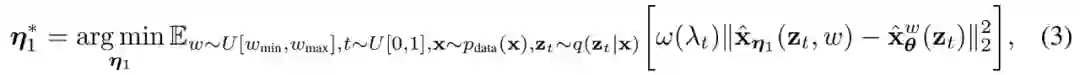 ,其可学习参数为η_2,每次采样步数减半。设 N 为采样步数,给定 w ~ U[w_min, w_max] 和 t∈{1,…, N},然后根据 Salimans & Ho 等人提出的方法训练学生模型。在将教师模型中的 2N 步蒸馏为学生模型中的 N 步之后,之后使用 N 步学生模型作为新的教师模型,这个过程不断重复,直到将教师模型蒸馏为 N/2 步学生模型。