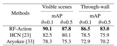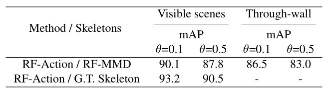 我们使用20个小时的数据集进行训练,并使用5个小时进行测试。数据集还包含2种穿墙方案,其中一种用于训练,一种用于测试。在穿墙环境下,将摄像头放在墙的每一侧,以便可以使用无线电设备对摄像头系统进行校准,并利用可以看到人员的摄像头来标记动作。RF-MMD上的所有测试结果仅使用无线电信号,无需基于视觉的输入。