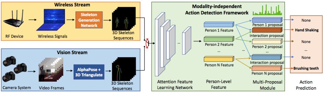 RF-Action从无线信号中检测人为行为。它首先从原始无线信号输入(黄色框)中提取每个人的3D骨架。然后,它对提取的骨架序列(绿色框)执行动作检测和识别。动作检测框架还可以将从视觉数据生成的3D骨架作为输入(蓝色框),从而可以使用RF生成的骨架和现有的基于骨架的动作识别数据集进行训练。