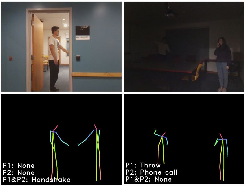 左上角的图中,两个人握手,而其中一个在墙后。右上角的图中,一个人躲在黑暗中,向另一个正在打电话的人扔东西。下面两张图是由他们的模型生成的骨架表示和动作预测。