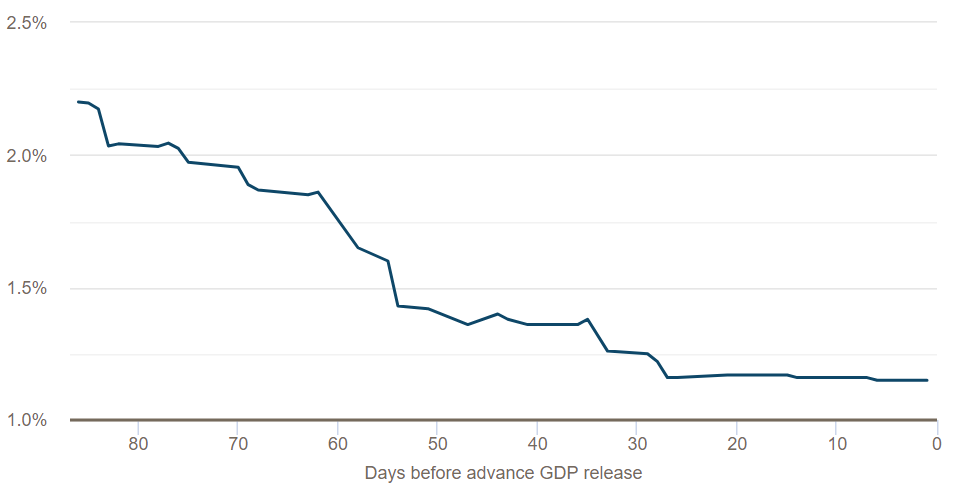 根据上述算法,预测的当期季度GDP增长值会发生实时变动,最终可以在官方数据披露之前得到一个估计值。最新一季度预测图表如下所示: