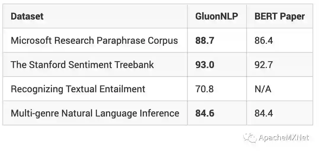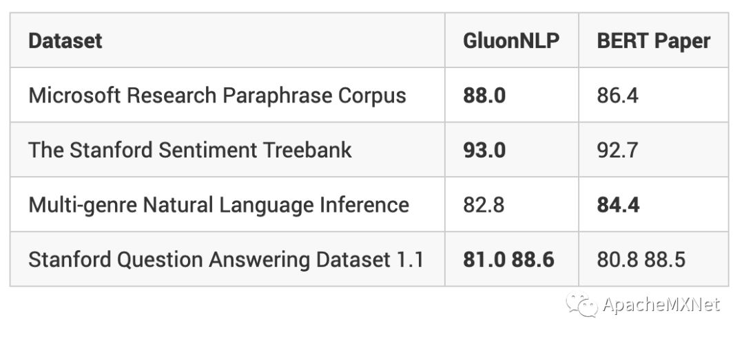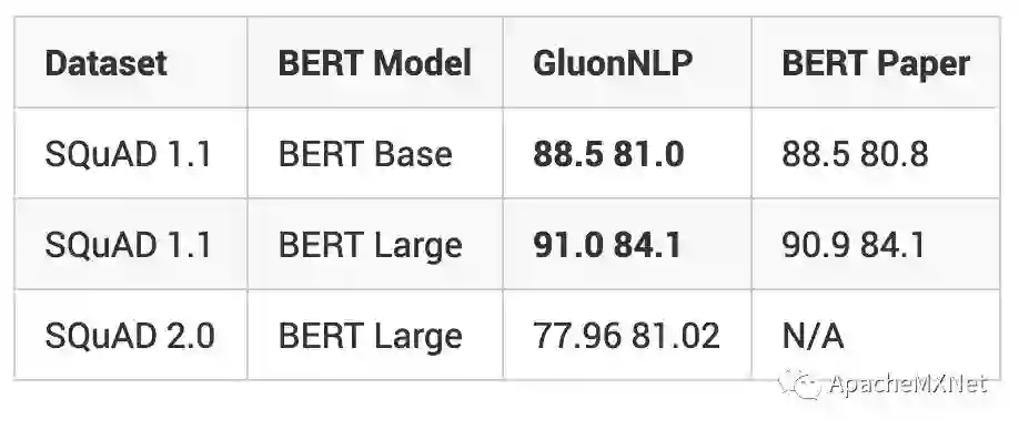 GluonNLP 的目标是?消灭无法复现的研究结果!我们提供了可复现 RTE [6]、MNLI [8]、SST-2、MRPC [10]、SQuAD 1.1 [9] 和 SQuAD 2.0[11] 最先进结果的训练脚本和训练日志。并且我们模块化的代码可以在同一框架内将 BERT 应用到各类任务上。 我们在以下问答任务数据集上得到了这些 F1 和精确匹配得分: