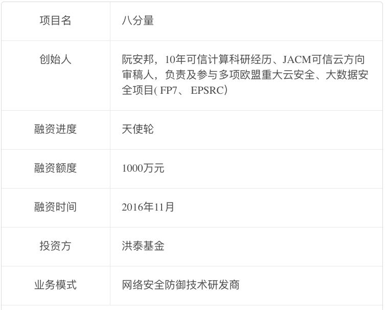 牛津大学博士阮安邦创办的“八分量”,便基于可信计算和异构共识区块链技术,对企业、政府等的服务器进行监控,构建持续免疫未知威胁的能力。其产品可在1秒内感知上万台服务器异常进程加载,10秒内感知异常操作行为,15秒内自动部署对抗和反击措施。