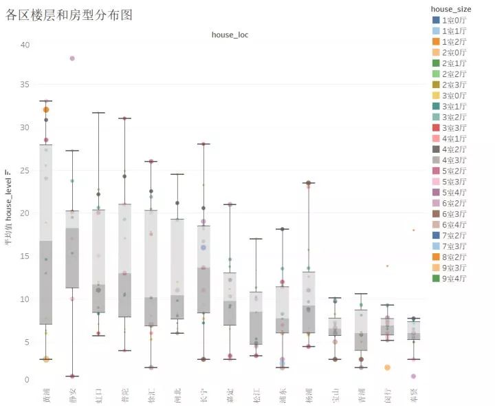 对于房屋所处楼层的方差来说,黄浦,静安,虹口,普陀等区的楼层分布都很不均匀,静安最高二手房楼层为33层,最低为3层,而变化最小的闵行,最高二手房楼层在9.32左右,最低的在5.20左右。