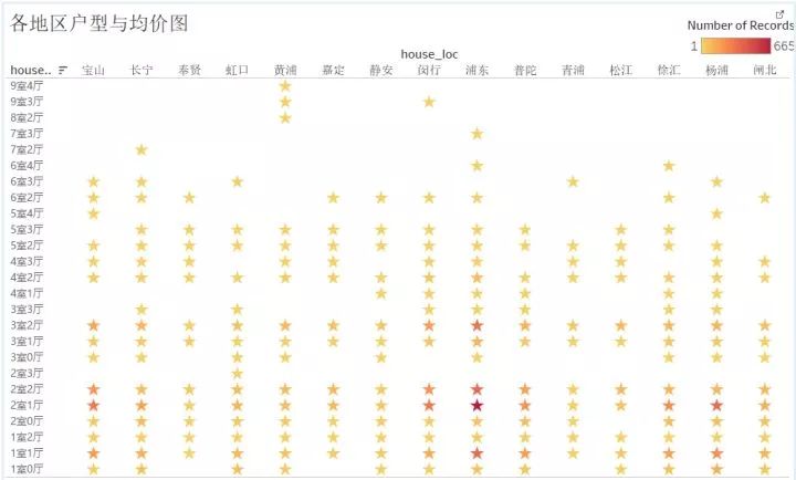 这是一个各地区的房源的户型图,每一个五角星的颜色越深,说明该类户型在该地区越多。这样我们可以直观看见,整个上海的2室1厅和2室2厅是最多的,其中浦东的2室1厅尤其(665个)。
