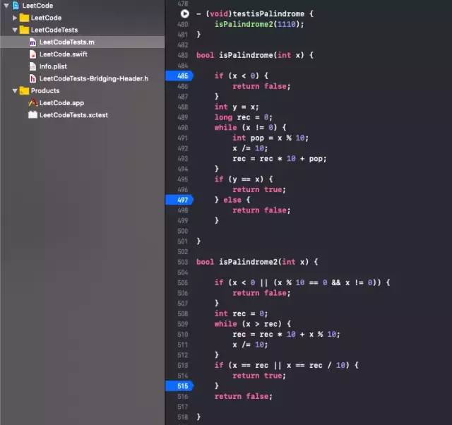 关于算法练习我们都会想到去LeetCode刷题。虽然LeetCode支持Swift答题,但是让人不爽的是有些处理字符串的题,用Swift作答会超时,所以笔者在练习时主要使用C和Swift作答。有时也会使用OC先理清思路,再使用其他语言进行作答。毕竟有些题需要边写边想,还有些需要进行调试才行。所以这也是用Playground不方便的地方,它不能进行断点调试。有了这些前提我就在想怎么才能使用现在工具,更好的进行算法题的练习呢?我想到了Xcode的单元测试,我们知道在继承自XCTestCase的类中实现以test为前缀的方法时,该方法前会生成一个菱形指示符,鼠标置于其上时会显示运行按钮,我们就可以通过该按钮运行测试用例,同时还支持断点调试。例如下图中的判断是否为回文数一题: