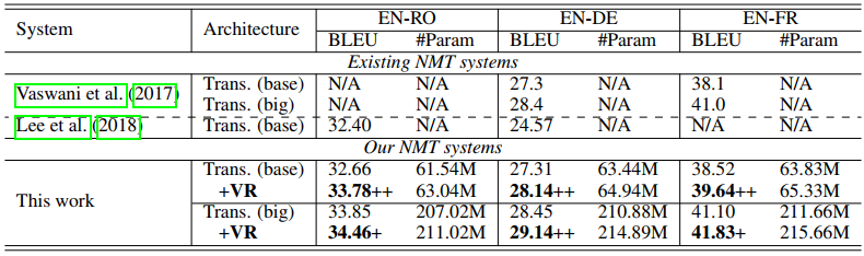 可以看到,和基线模型(Trans.(base/big))相比,本文的方法(+VR)在三个数据集上都能得到显著的提升,平均提升约一个BLEU值。同时,只引入了很少的参数量,这就不会使训练时间几乎不会增加。