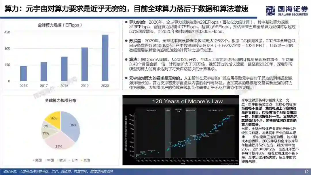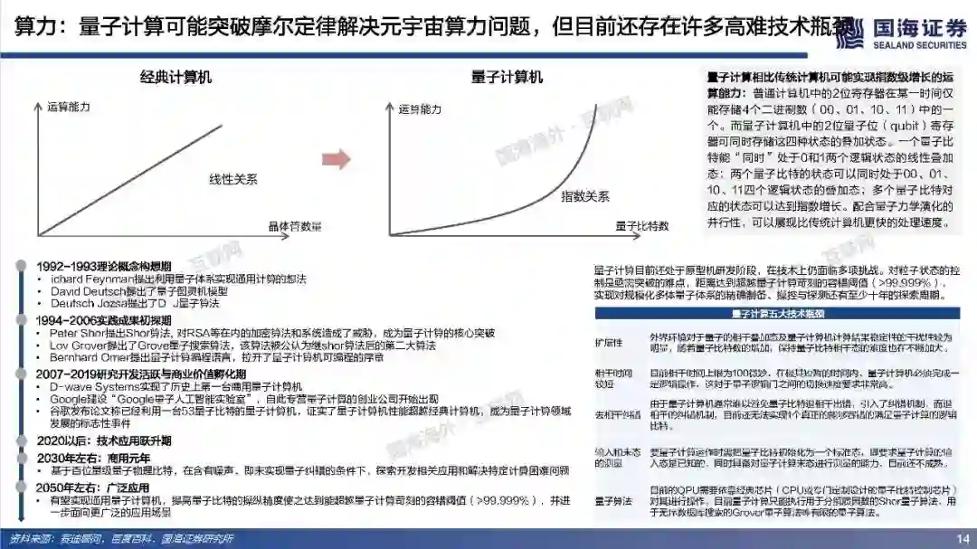 (2)算力:元宇宙对算力要求是近乎无穷的,目前全球算力远远落后于数据和算法增速。人工智能在元宇宙的广泛应用导致元宇宙对于算力的消耗是指数爆炸增长的,算力支撑着元宇宙虚拟内容的创作与体验,更加真实的建模与交互需要更强的算力作为前提,大规模用户的持续在线和创作需要近乎无尽的算力作为支撑。量子计算可能突破摩尔定律解决元宇宙算力问题,但目前还存在许多高难技术瓶颈,预计在2050年以后才有可能实现通用量子计算机,提高量子比特的操纵精度,从而有条件进行面向更广泛的应用场景。