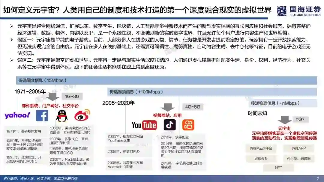 (1)如何定义元宇宙:从信息传递角度,元宇宙将使得人类从传递图文信息、传递视频信息进化到传递物理信息,实现在一个虚拟空间传递现实的互动行为。元宇宙是整合网络通信、扩展现实、数字孪生、区块链、人工智能等多种新技术而产生的新型虚实相融的互联网应用和社会形态,拥有完整的经济逻辑、数据、物体、内容以及IP,是一个永续在线、不断被刷新的实时数字世界,并且允许每个用户进行内容生产和世界编辑。