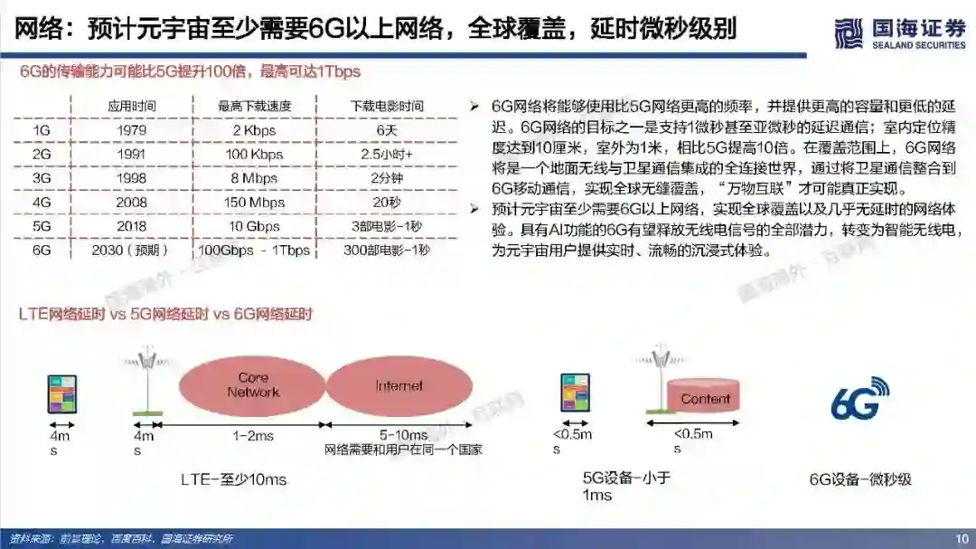 (1)网络:预计元宇宙至少需要6G以上网络,6G网络有望在2030年开始商用。在覆盖范围上,6G网络将是一个地面无线与卫星通信集成的全连接世界,通过将卫星通信整合到6G移动通信,实现全球无缝覆盖,“万物互联”才可能真正实现。具有AI功能的6G有望释放无线电信号的全部潜力,转变为智能无线电,为元宇宙用户提供实时、流畅的沉浸式体验。