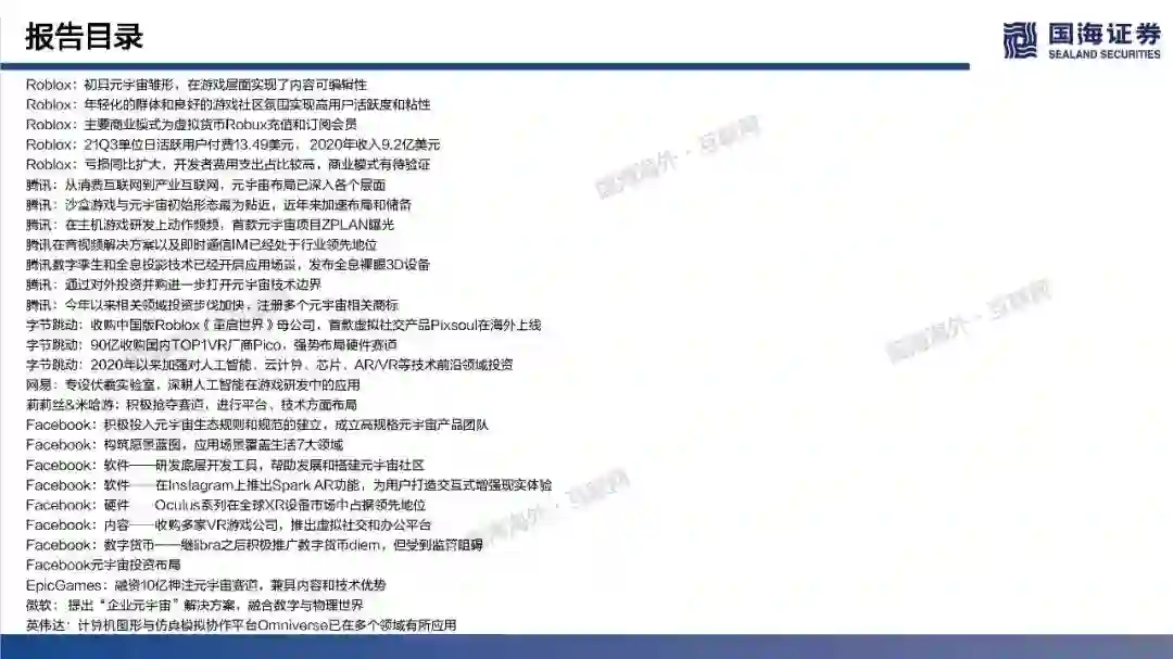 (1)Roblox:初具元宇宙雏形,在游戏层面实现了内容可编辑性,平台年轻化的群体和良好的游戏社区氛围实现高用户活跃度和粘性,2021Q3Roblox日活跃用户数4730万人,人均单日使用时长高达2.63小时。然而在元宇宙的进程中,Roblox还处于比较早期阶段,其提供的工具虽然实现了自由创作,仍然具备一定门槛性,限制了人们自由创作的边界,后续全球化+高龄化的扩张破圈有待观察。