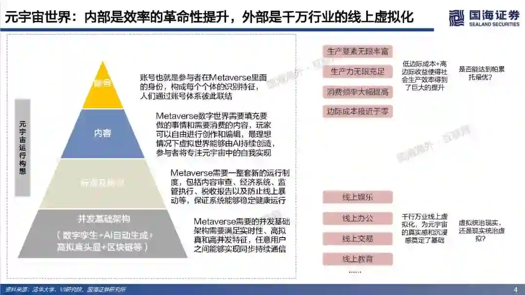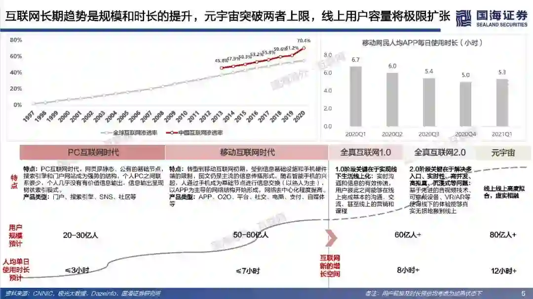 (2)理想的元宇宙将实现效率的革命性提升和线上用户容量的极限扩张。在一个理想的元宇宙世界,物理世界的无限虚拟化使得生产要素无限丰富、生产力无限充足、近乎于0的边际成本使得社会生产效率得到了巨大的提升;互联网长期趋势是规模和时长的持续提升,元宇宙突破两者在现有条件下的上限,人类线上用户容量将极限扩张(80亿人+、12小时+)。