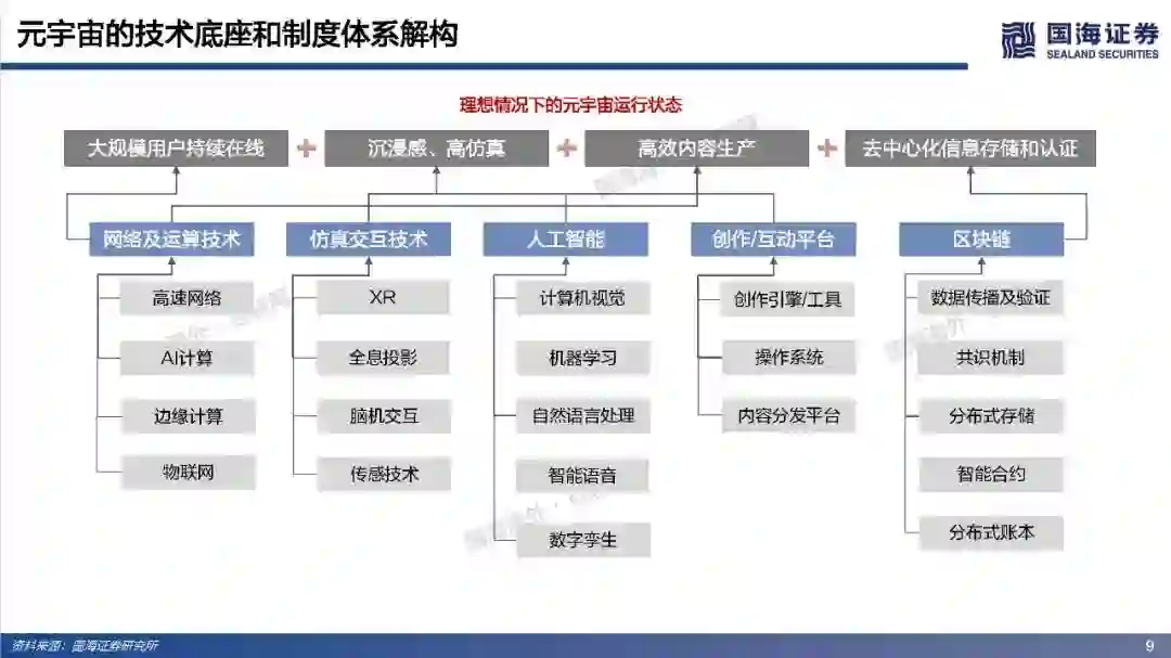 理想情况下的元宇宙运行状态=大规模用户持续在线+高沉浸感/高仿真+高效内容生产+去中心化信息存储和认证。为实现这一理想运行状态,至少需要五层基础技术底座支撑:网络及运算技术、仿真交互技术、人工智能技术、创作工具/内容分发平台和区块链技术。整体来看,我们认为元宇宙是人类对一个能够自由探索的理想虚拟世界的美好愿景,但目前距离元宇宙得以实现所要求的技术基础还相去甚远,未来还有很长的路要走。