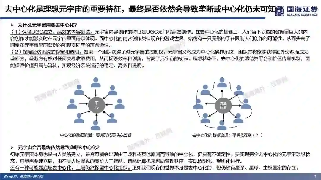 (4)去中心化是理想元宇宙的重要特征,最终是否依然会导致垄断或中心化仍未可知。元宇宙的去中心化一方面是为了保障UGC独立、高效地内容创造;另一方面是保障经济系统的稳定和透明,遏制寡头和垄断。然而初始元宇宙本身也是由人类所建立,是否可能会出现由于逐利或其他原因而导致的中心化,仍具有不确定性。要实现完全去中心化的元宇宙理想状态,可能需要建立后,由不受人性操纵的高阶人工智能、智能计算机来帮助管理秩序,实现透明化、规则化运行。还有一种可能是底层去中心化,上层仍然保留中心化组织。
