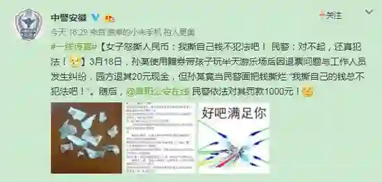 1、@小小编辑:3月18日,孙某使用赠券带孩子玩半天游乐场后因退票问题与工作人员发生纠纷,园方退其20元现金,但孙某竟当民警面把钱撕烂:“我撕自己的钱总不犯法吧!”。随后,@阜阳公安在线 民警依法对其罚款1000元!#乱弹大吐槽#