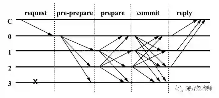「commit」:每个师长收到2f个师长(军长不做prepare)的“收到”请求后发送“随时开干”给军长和其他两个师长。(f为可容忍的拜占庭节点数)