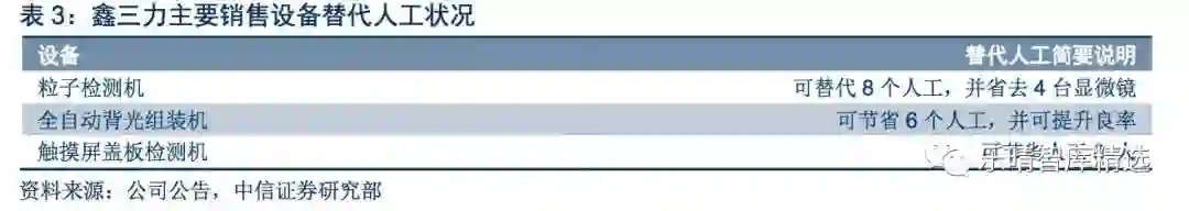 相较过去的半自动化生产模式,每台自动组装设备约可代替3-5名工人及1名产线管理人员,每台自动检测设备则可代替约10名工人及2名产线管理人员;再考虑到鑫三力相对于国外设备的成本优势,人工节约+产能提高是下游厂商较为合理的选择。