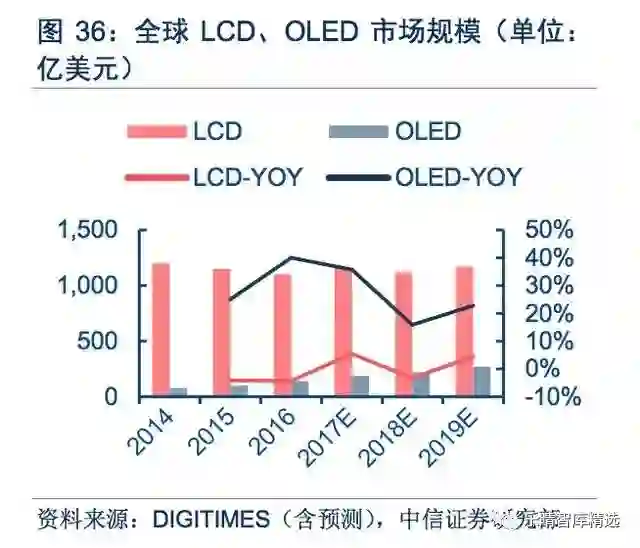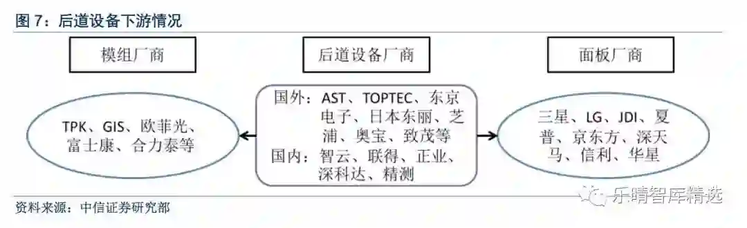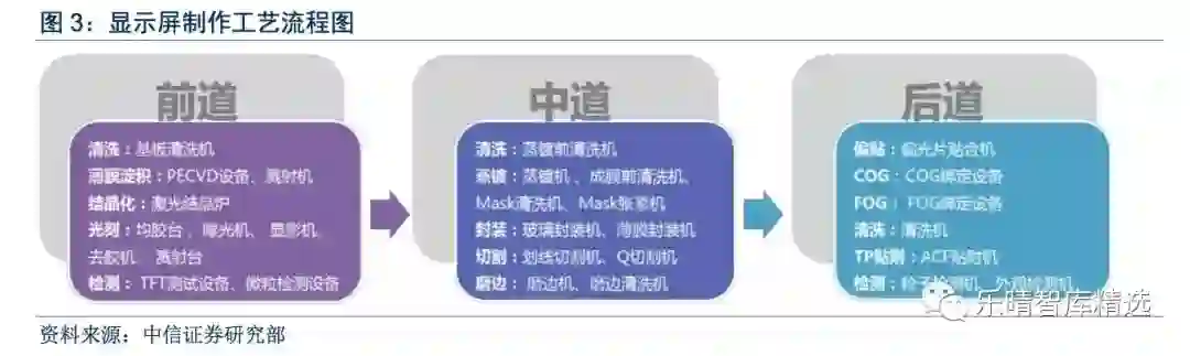 无论传统LCD及新兴OLED面板,均需要前、中、后三道工艺,前道制作背板驱动电极,中道完成液晶模组或发光材料的制作,后道为自动化的组装和检测。