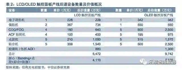 相对于传统LCD屏幕组装线,OLED组装中所需后道设备要求更高,核心设备(bonding+贴合+点胶+检测)价值量将从4,000万元左右上升至约8,000万元。