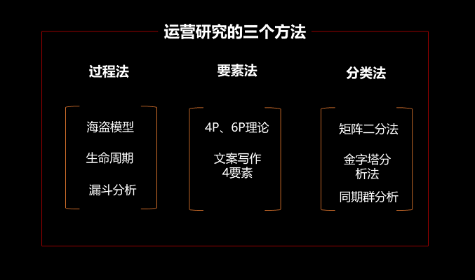大家可以注意观察,很多好用的模型基本是按照过程法、要素法、分类法总结出来的,除了可以运用模型指导我们的运营实践外,我们大可以照这三个方法总结适合自己公司或部门业务的差异化模型。