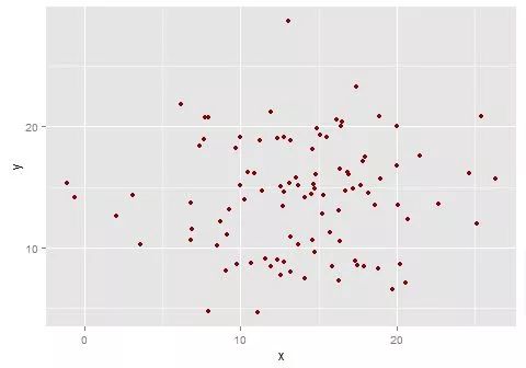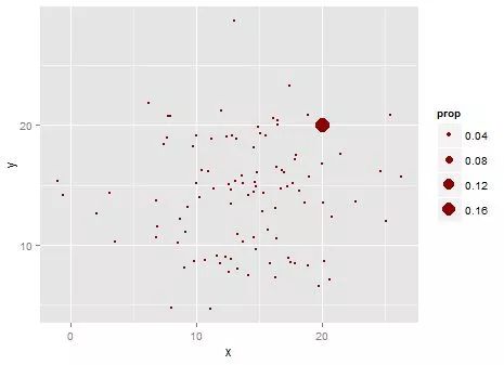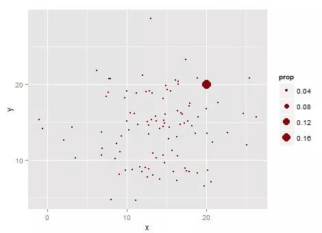 好了,解释一下,stat_sum实际的意思就是按照某一点占所有点出现频率然后换算成大小来作图,因此,以上代码就可以得到下面这张图,因为(20,20)这个点出现频率为20/120=16.667%: