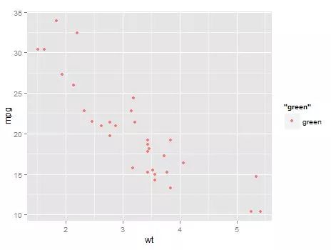 首先,数据的初始化跟上面那个例子是相同的。然后,因为color放到了aes里,于是ggplot开始搜索mtcars里面的向量了,发现没有叫"green"的,然后又找了global,也没有。于是,ggplot就开始把它认作了一个新的向量。等等,有个问题,我要按照这个向量来分别染色,而事实上,这个向量长度为1,怎么办?ggplot就先把他展开成了factor(rep("green",nrow(mtcars)),levels = unique("green")),bingo!现在开始染色了。第一个数据mtcars$mpg[1]、mtcars$wt[1],其颜色变量是"green",因子水平是1,染成默认调色第一种,哦,就是这个蛋蛋的粉红色;再染第二个,还是"green",因子水平也是1,染成蛋蛋的粉红色;... 终于完成了,咦?怎么都是蛋蛋的粉红色。