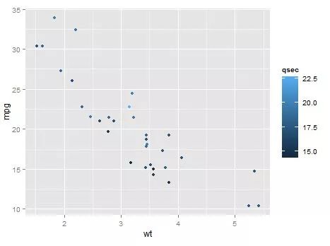 code 2: 指定了qsec作为其染色的标准(分组),qsec为numeric变量,因此,应该选择连续型的标尺,而不是分组染色。然后开始绘制,读取mtcars$mpg[1]、mtcars$wt[1],确定位置,然后为其染成mtcars$qsec[1]颜色;再绘制第二点。