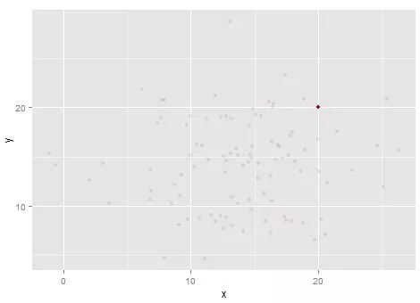 大家可以发现,我在(20,20)这个点的数据事实上是有20个的,但由于没做统计转换(20,20)这个点被画了20次,因此我们理论上看到的点其实是最后一次画的那个点。可能这不够直观,没关系,我们调整一下透明度到10%: