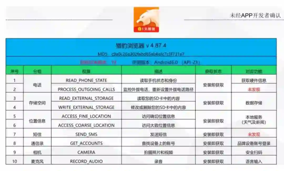 11月28日下午,上海市消保委通报关于规范浏览器、输入法、综合视频等手机APP涉及个人信息权限的测评结果。其中,猎豹浏览器(V4.87.4)Android的API版本过低、申请了与电话相关的权限、与短信相关权限,具体用途不明。而猎豹浏览器也默认开通监听外拨电话、位置信息、发送短信的权限。