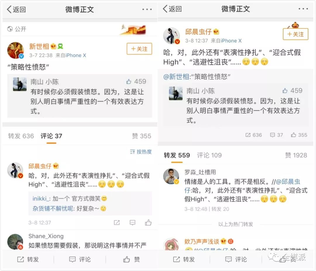 3月7日@新世相提出“策略性愤怒”一词,在奇葩说辩手@邱晨虫仔转发并补充“表演性挣扎”、“迎合式假high”、“逃避性沮丧”三词后,转评赞的数量统统都实现了质的飞跃,不少网友转发表认同的同时也纷纷加入到补充新词的队伍中。
