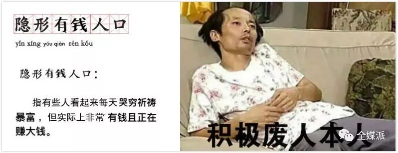 在“积极废人”刷屏之前,朋友圈的网红还是“隐形贫困人口”。根据网络上的定义,“隐形贫困人口”是指那些看起来每天有吃有喝,但实际上非常穷的人。感同身受的网友们在“隐形贫困”的基础上,还细分了各种领域,诸如“隐形贫困化妆”、“隐形贫困健身”等等,淋漓尽致地表现了当下年轻人表面风风光光,背地里穷得叮当响的生存现状。
