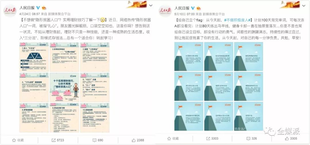 正能量官微们也是热点的追逐者,@人民日报在热词流行期间发布实用理财技巧以及克服拖延症指南等内容,成为众多跟热点博主中的一股清流,在它强大的号召力下,一些官微也相继转发成为正能量大军中的一员。