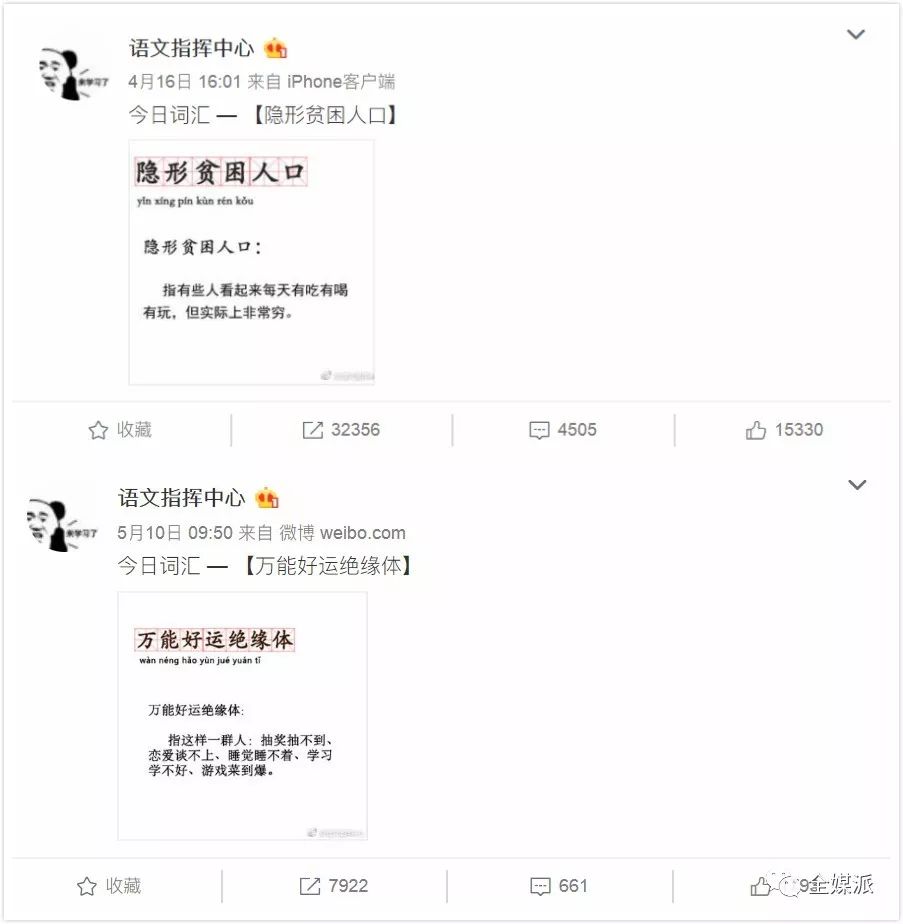 每一个成功热词的背后都站着N个微博大V。微博博主@语文指挥中心在4月16日凭借着“隐形贫困人口”一词成名。其言简意赅的造词造句能力、极度写实的描写刻画,成功吸引九万粉丝慕名前来,不少网友嘴上说着“内容引起极度不适,举报了”,却还是捂着心口按下了转发键。