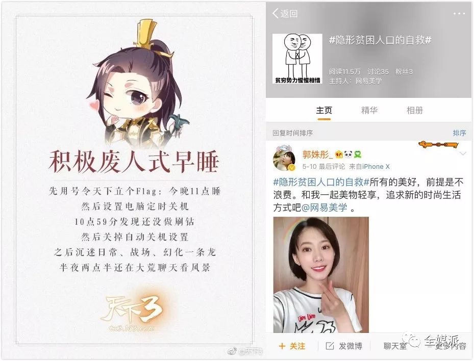 品牌官微在这场流量争夺战中也不认输,官微@天下3用游戏中的场景来创造与解释热词,将“寓教于乐”贯彻到底。@网易美学则发起#隐形贫困人口的自救#的话题,邀请明星以及美妆博主作为“扶贫指挥官”为贫民窟女孩们推荐众多平价好物。