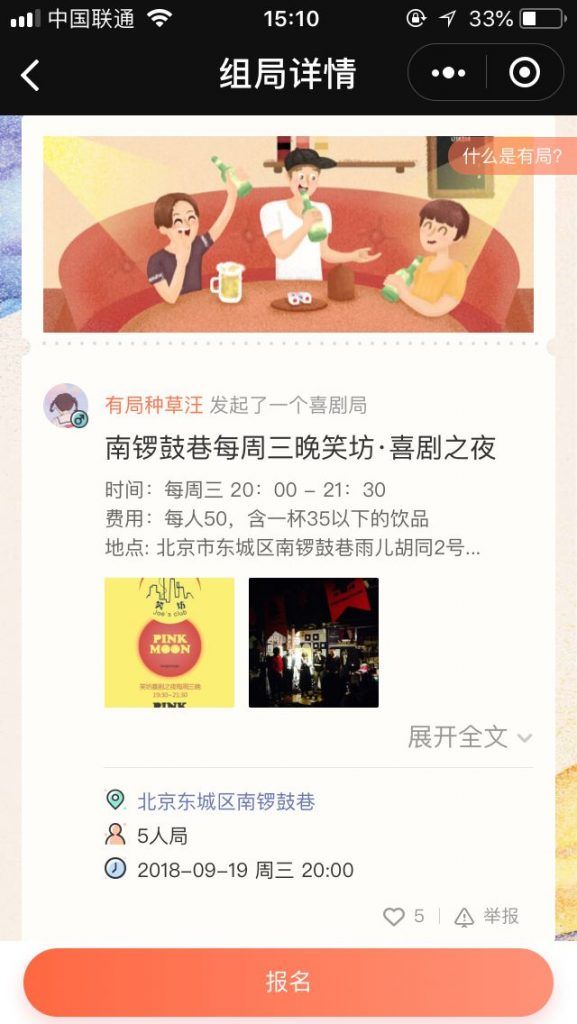 顾名思义,它首先就是为了线下社交而存在的。很多时候,不知道假期去哪里的你可能更想去蹭一个局,这时你可以在「一起有局」的首页栏目中看到系统推荐的同城美食展览活动。「一起有局」的详情页会描述活动的具体人数、目的和具体费用,这样明码标价就避免了很多陌生人之间为买单的烦恼而闹不愉快的尴尬。当你对某个设局的活动有意向,点击报名届时就可以参与了。