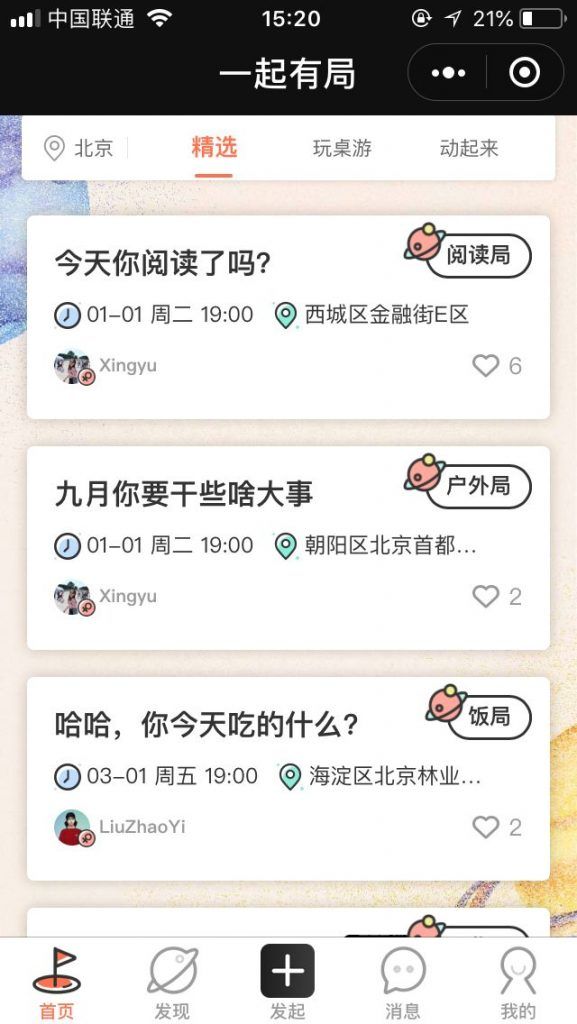 目前,「一起有局」刚上线不久,分类栏目中只可见有精选、桌游、运动这些活动,你也可以根据所在地的地理位置查找周围有趣的活动。当然你也可以主动发起,这也就是我们接下来要说的。