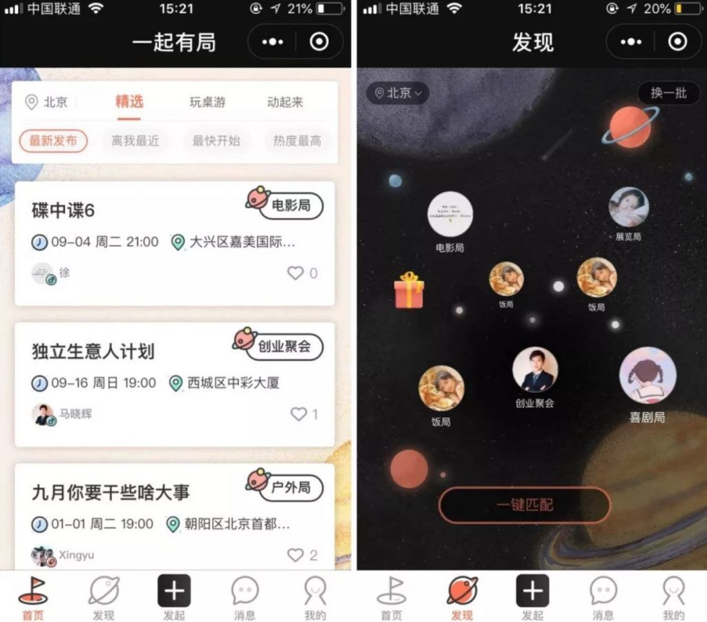 建议新来的朋友可以多在“首页”随便看看抢注自己感兴趣的某个局,或者在“发现”里根据标签随机匹配,发现自己感兴趣的局。值得一提的是,这个发现标签页做成了一个个星球的设计样式,似乎也有着连接无数平行宇宙以及无数可能性的涵义,对于独在异乡为异客的中国亿万年轻人来说,这样子找到志同道合的朋友也算是一种不错的慰藉。