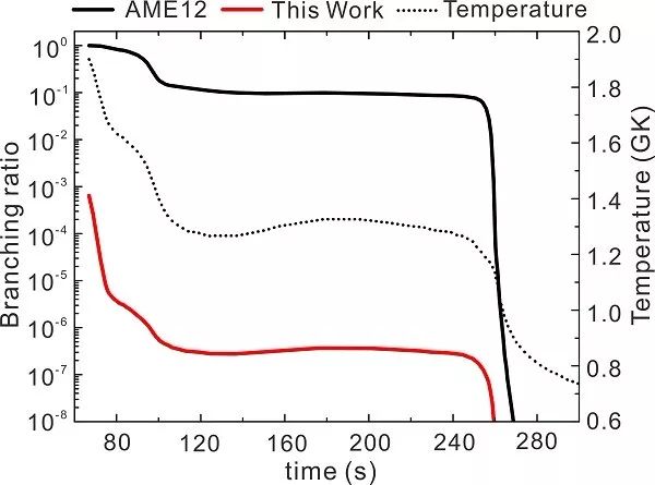 基于新的质量数据,重新计算了相关核子分离能,结果否定了Mo,Tc丰质子区同位素低α分离能岛的存在。为了定量研究这些新测核素质量对rp过程的影响,科研人员利用I型x-射线暴模型重新计算了rp过程核反应路径的走向,得到了Zr-Nb循环分支比的比例,在温度低于1.9GK的情况下,否定了Zr-Nb循环对rp过程具有较大贡献的可能性。
