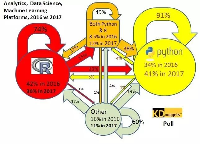从 2016 年到 2017 年,只有 5% 的 Python 用户转向 R 语言,而 R 语言用户转向 Python 的则是10%,相当于前者的两倍。另外,2016 年同时使用两种语言的人中,只有 49% 的人还在继续使用这两种语言,38% 的人转向 Python,11% 的人转向 R 语言。