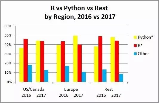 从上图数据可以看出,R 的使用份额持续下降(从 2015 年的约 50%到 2017 年的 36%) ,而 Python 份额正在快速增长 - 从 2014 年的 23% 上升到 2017 年的 47%。其他平台的份额也在逐渐下降。
